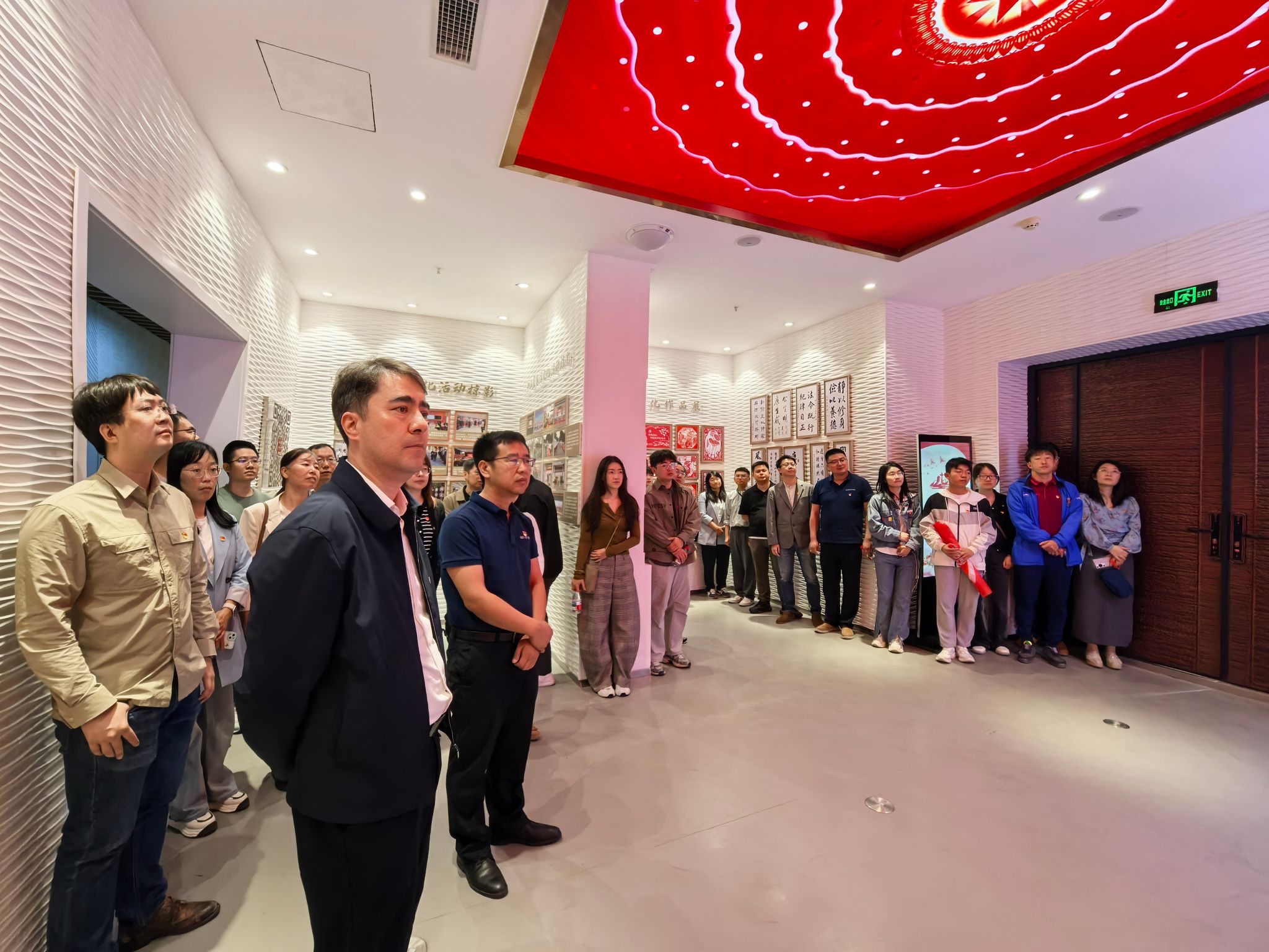 在廉洁人生体验馆内,党员干部们跟随讲解员的步伐,依次参观了各个主题展区。通过丰富的图文资料、生动的多媒体展示以及逼真的场景模拟,深入了解了党的反腐倡廉历程、廉洁文化的深厚内涵以及违纪违法典型案例,引导着党员干部们深刻思考廉洁从政、廉洁用权、廉洁修身、廉洁齐家的重要意义。随后,在党旗下,重温入党誓词。