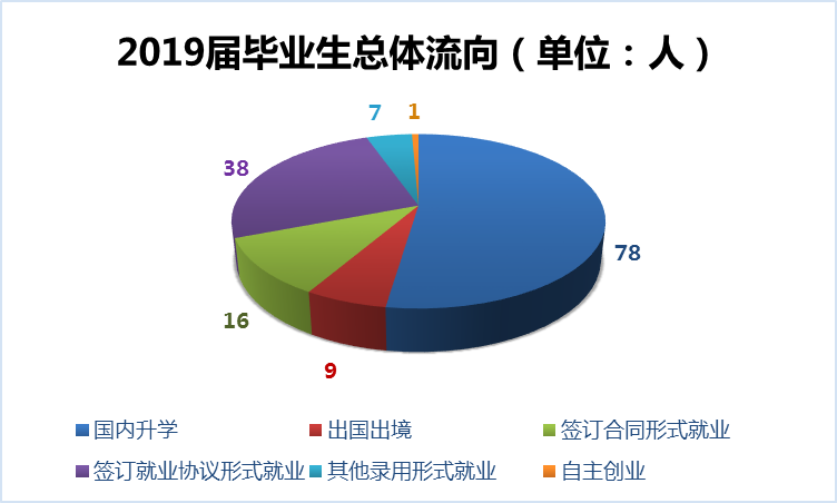 2019届毕业生国内成功升学总人数为83人,升学率为 48.26%,其中,本校读研比例为65.06%,外校读研比例为34.94%,主要集中在上海交通大学(10人)、浙江大学(5人)、西安交通大学(5人)等985高校。